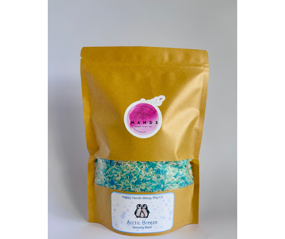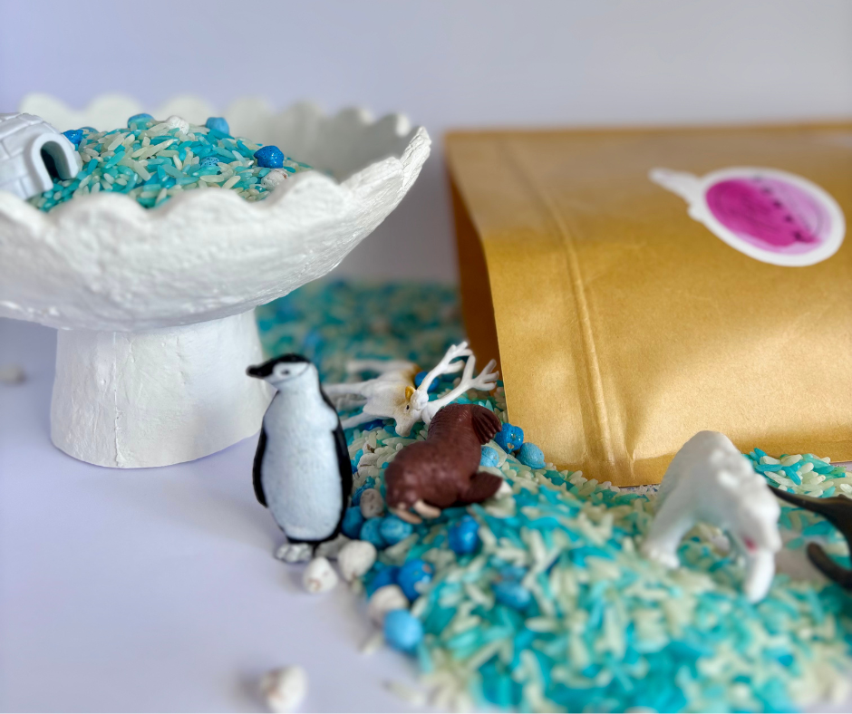 A calming sensory base in icy blue and soft white, scattered with winter pebbles and five mini polar animals. Pour, scoop, and create a snowy sensory world that invites storytelling and small world play.
