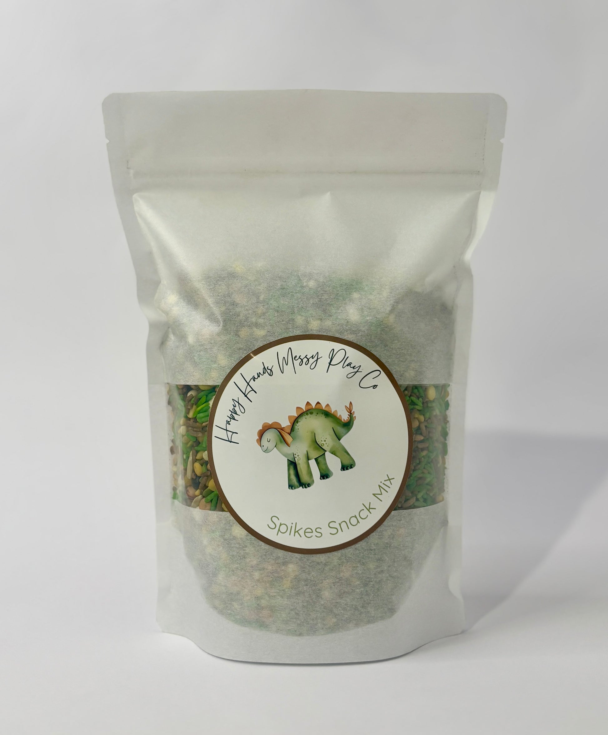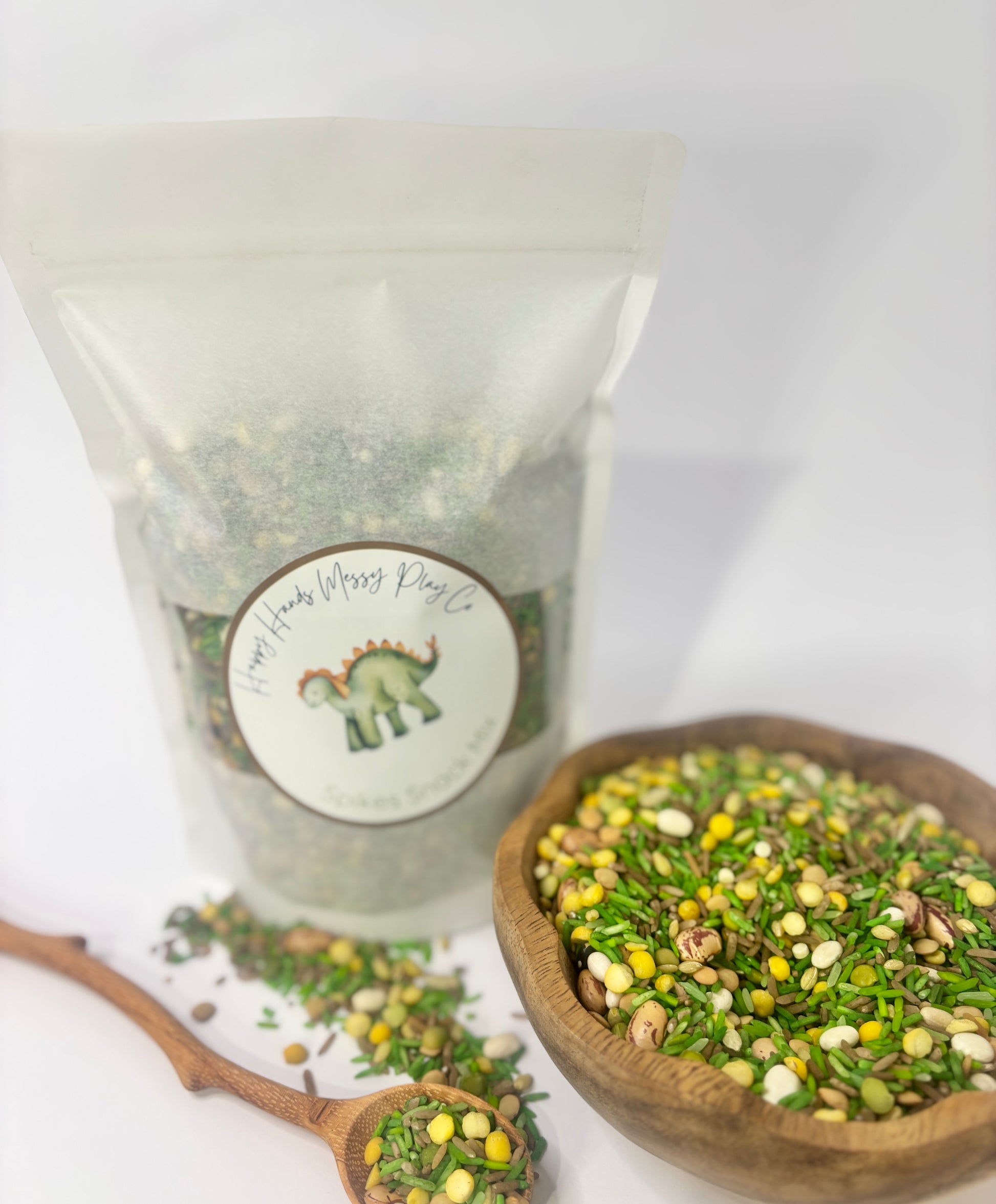 Crunchy, colourful, and full of prehistoric texture — Spike’s Snack Mix is a dino-approved sensory base made from a nourishing blend of green rice, split peas, lentils, seeds, and chickpeas.